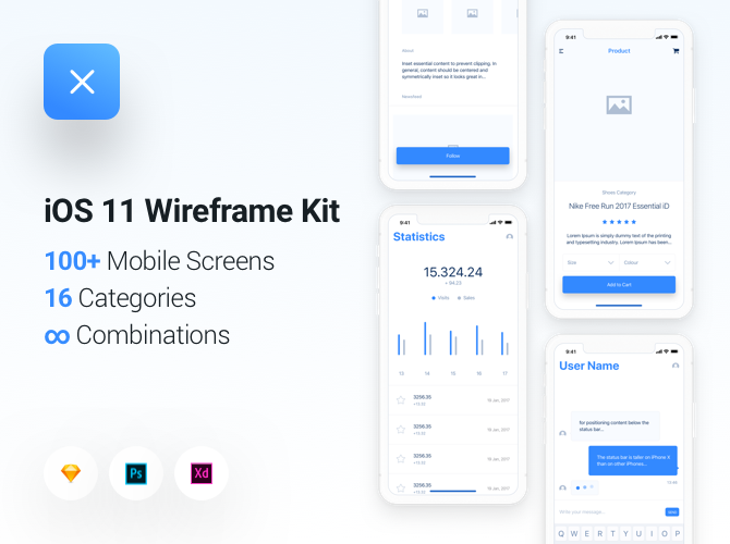 UIXO is a collection of 105 beautiful wireframes of iOS 11 screens for iPhone X. UIXO iOS 11 Wireframes will help you to start & prototype any iOS app for iPhone X. In files you will find 16 the most popular categories: Start, Signup, Walkthrough, Loading, Profiles, Feed, Articles, Activity, Create, Chat, Store, Shop, Shopping Carts, Checkout, Payment, Navigation, Photos, Dashboard, Statistics. Each screen is fully customizable, exceptionally easy to use and carefully layered and grouped in Sketch app, Adobe Photoshop & Adobe Xd