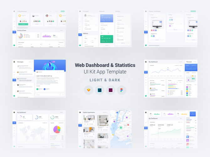 Web Dashboard & Stats UI Kit with 20 web app screens in two color variations - light & dark.